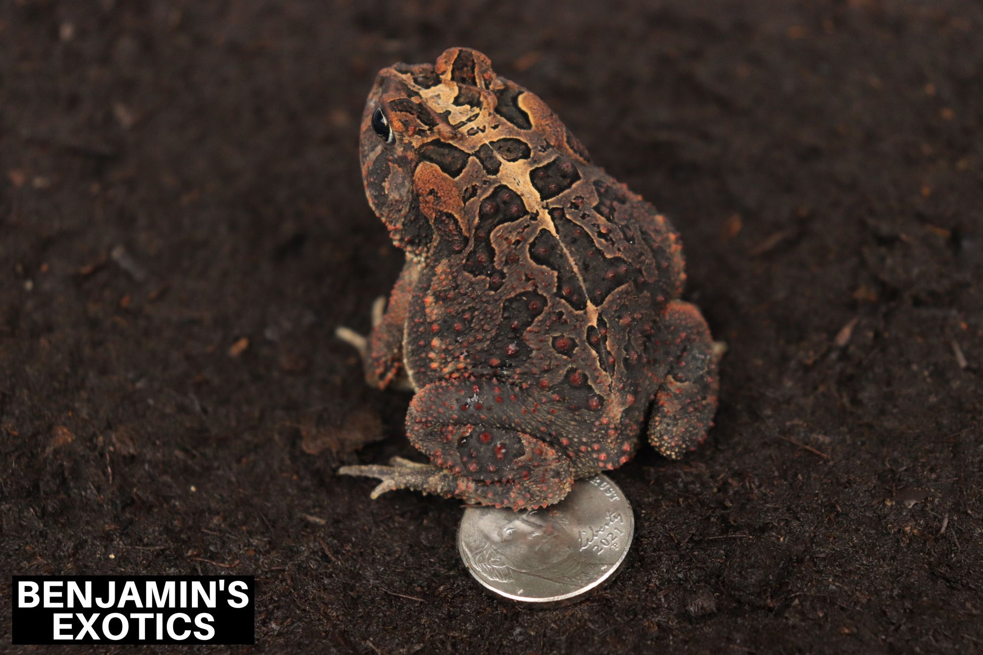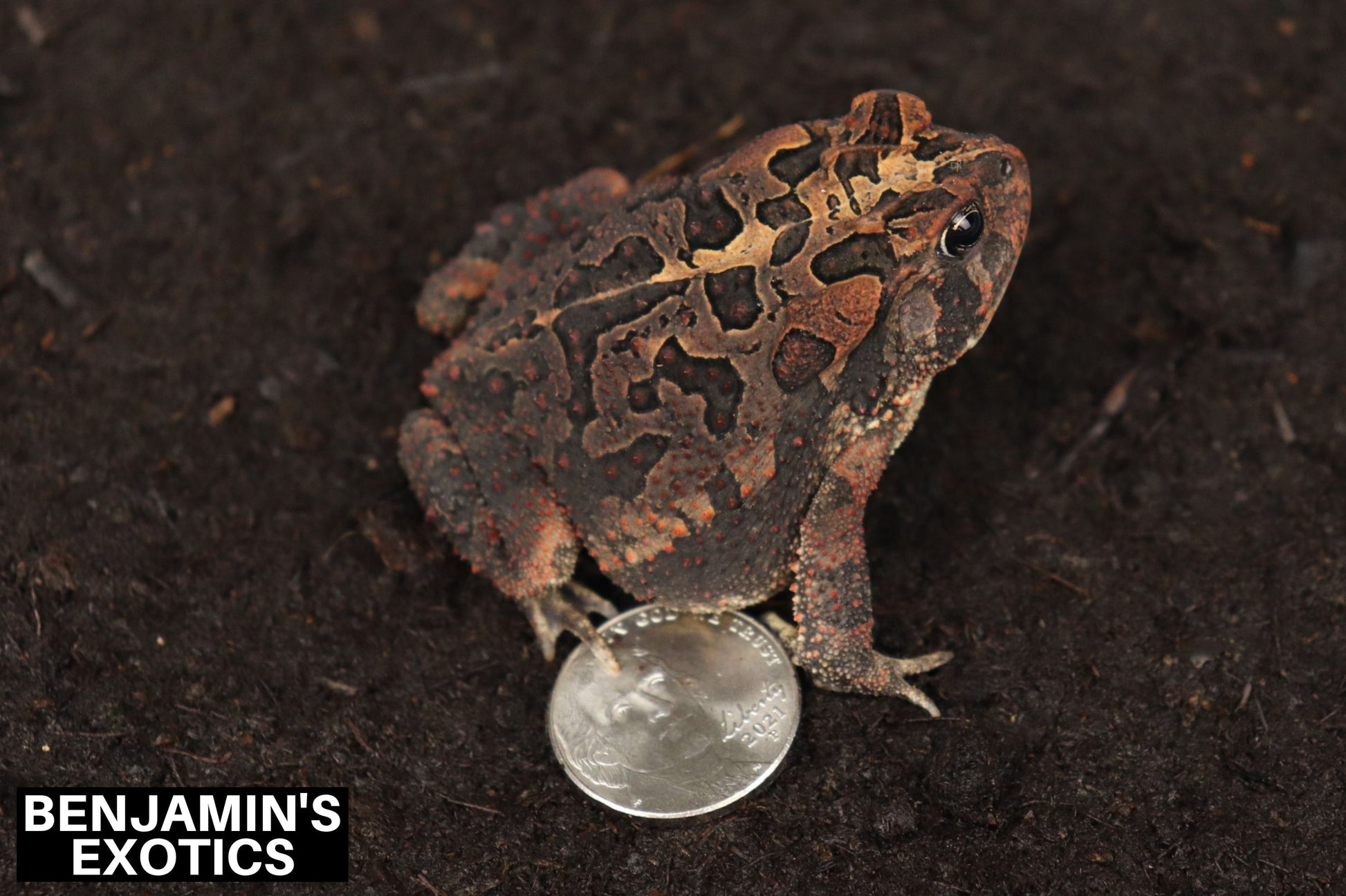 These are captive bred subadult female Southern Toads (Anaxyrus terrestris) produced in house here at Benjamin's Exotics. They were spawned on January 27th, 2023. They were produced from a pair of holdback F1 CBB adults, a bloodline originally collected in Levy county, Florida. They are currently feeding on calcium and vitamin dusted red runner roaches, dubia roaches, mealworms, and pinky mice.